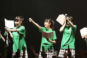 科学部ライブ後にMCとして登場したのは野津友那乃、大賀咲希、磯野莉音の3人。「いつも中3のメンバーに頼ってばかりだけど、今回は思い切って莉音たちがやろうと思います!」と、意気込みを語る磯野莉音。しかし3人でのMCが少し不安ということで、トーク委員長の杉﨑寧々が今回のMCをプロデュースしたそうだ。そのことについて野津友那乃は「私たちのトークが上手くいかなかったら、杉﨑先輩のせいなので、気が楽になりました!」とさっそく会場の笑いをさそっていた。
