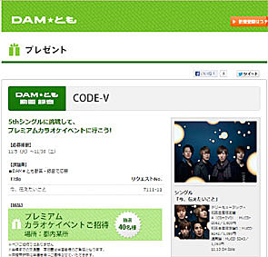 CODE-Vのプレミアムカラオケイベントに参加できるプレゼント企画が、第一興商が運営する通信カラオケDAMと連動したサービス「DAM★とも」でスタートした。