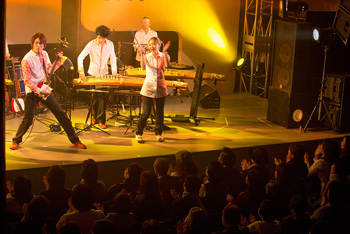 ここで、井上公平から挨拶。「集大成の曲を」と紹介して演奏したのは「となりのトトロ」。これは、海外で演奏した際に、振り付けを逆輸入したもの。トトロ♪トトロ♪の部分に振りが入る。なんともキュートな振りだ。そして、4月に蔵王堂で共演した中孝介からのビデオメッセージのあと、川口恭吾の「桜」。十七絃(箏)で音を繋ぎながら、箏の市川慎、同じく箏の山野安珠美、尺八の石垣秀基、篠笛の山田路子で唱歌「もみじ」。この季節にぴったりな楽曲だ。