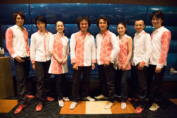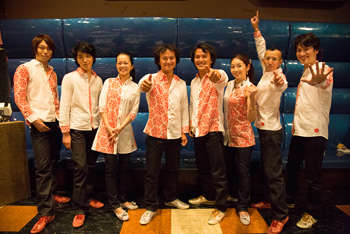 再び8人に戻る。いつか8人の衣装がチェンジ。さっきまでのフォーマルな印象の大島紬から、大島紬の衣装デザイナーでもある服部幸之助氏のデザインによるカジュアルなシャツに。8人の衣装は、すべて柄の入り方が違う。そして、純国産ジーンズの“桃太郎JEANS”に、同じくMADE IN JAPANスニーカー“オニツカタイガー”だ。彼らが伝えるものは、音楽とともに日本。西洋のブランドも、実は日本のものを参考にしたという例もある。そう、日本のものは格好いいのだ。