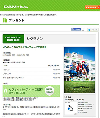 3rd Single収録曲である「マナザシ」がTBS系ドラマ月曜ミステリーシアター「刑事のまなざし」(主演:椎名桔平)の主題歌に、「ブチコメ!!」が日本テレビTVアニメーションシリーズ「はじめの一歩 Rising」エンディングテーマになるなど、話題を集めているシクラメン。彼らと「DAM★とも」とのコラボによるプレゼント企画は、カラオケを歌って応募すると抽選で9組18名がシクラメンのメンバーとのカラオケパーティーに招待されるという、非常にレアなもの。パーティーの会場は「都内某所」とシークレットになっている。