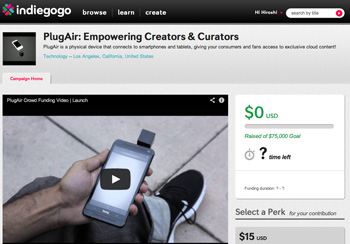 そして、リンキン・パーク限定PlugAirの発表と同時に、米クラウドファンディングサービス「Indiegogo」にてPlugAirのキャンペーンも開始された。クラウドファンディングは、ホームページに公開された商品、事業などを見て、その内容を応援したいと思った一般の人からインターネット上で支援金を募るサービスのことで、その中でもIndieGogoは、あるプロジェクトではクラウドファンディング史上最大の12億円の資金調達を成功させるなど世界的に注目されている。今回のIndieGogoによるPlugAirのキャンペーンは日本人も参加が可能で、キャンペーン参加で得られる景品として、限定のPlugAirグッズや、日本のチームに会う企画などが準備されている。