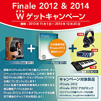 エムアイセブンジャパンでは、この「Finale 2014」アナウンスを記念して、現行バージョンの「Finale 2012 日本語版」を購入しキャンペーンサイトから申し込んだ人全員に、「Finale 2014 日本語版」を発売時に無料でプレゼントする「Finale 2012 & 2014 Wゲットキャンペーン」を実施。さらに申込者を対象とした周辺機器が当たる抽選プレゼントも用意する