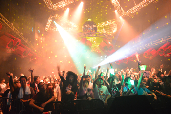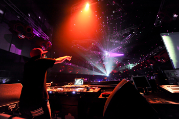 開演に先立ち一番大きなフロアARENAに足を踏み入れると、普段は天井の高さに吊るされているageha名物の巨大なスピーカー群「オクタゴン」が3m程の高さに下げられていた。ステージ上では、テストをするDJブースの背後に巨大なスクリーン。この音楽シーンが映像との係わり抜きには語れない事を示している。