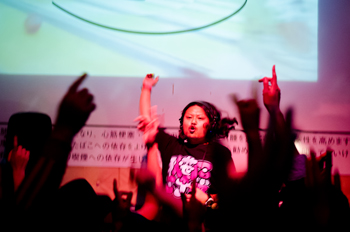 DJ WILDPARTYに続いてARENAに登場したのはライブセットの2組目、川田まみ。大勢のアニメ好きのオーディエンスが、大音量で、立て続けに、そして生歌で「灼眼のシャナ」や「とある魔術の禁書目録」の歌を聴いたらどうなるか想像できるだろうか?怒涛のメドレーに圧巻としか言いようがなかった。