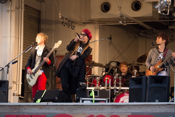 そのイントロをかき消すほどの悲鳴にも似た歓声が轟き、「World’s End」でライヴがスタート。道行く人をも巻き込む勢いに乗って、立て続けに「G.G」を演奏したMUCC、ヴォーカリストの逹瑯がMCでこう告げる。