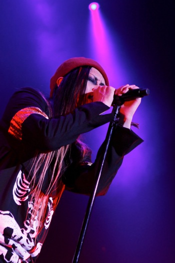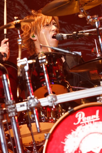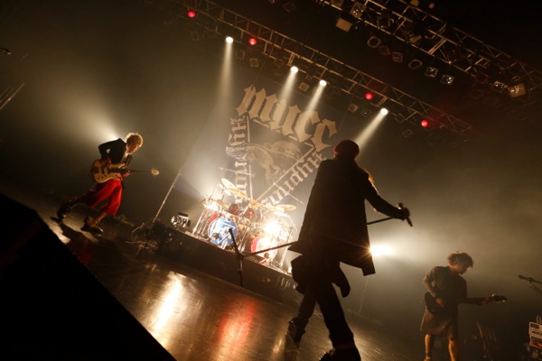 YUKKEがアップライトベースを掲げると、逹瑯の「いこうか」という声で3人ステージ中央で向かいあったかと思うと“ウォーッ!”という掛け事ともに「World’s End」のカップリング「自演奴」へ。「死んでもらおうと思って」と演奏された「咆哮」では、リズム隊がたたき出すスラッシュ・ビートが会場を震わせる。ミヤが「声出せー!」と叫ぶと、もう頭を振らずにはいられない。