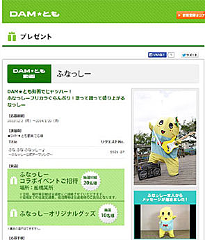 プレゼント企画は、カラオケ店舗で課題曲の「ふな ふな ふなっしー♪ ~ふなっしー公式テーマソング~」を歌って、撮影(DAM★とも動画)のうえ、DAM★ともサイトで応募することで参加できる。動画の投稿にはDAM★とも会員の登録(無料)が必要だ。