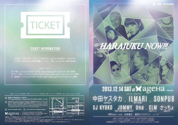 そして、ARENA、WATER、BOX、ISLANDという4つの音楽フロアには、中田ヤスタカ(CAPSULE) 、ILMARI(RIP SLYME)、くるっちょ(CLM&さっちょ) をはじめ多くのアーティスト、DJらが登場。オーバーグラウンドからアンダーグラウンドまで、<HARAJUKU NOW!!!>でしか成しえないジャンルを超えたラインナップがageHaを揺らす。