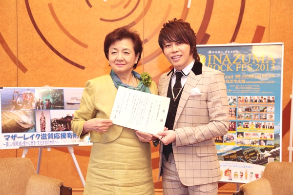 滋賀ふるさと観光大使を務めるアーティストT.M.Revolution こと西川貴教が12月12日、滋賀県公館と草津市役所を訪れ、9月に開催した<イナズマロック フェス 2013>の収益の一部である250万円を滋賀県に、50万円を草津市に寄付した。またこれに併せて<イナズマロック フェス2013>出演者により実施した『琵琶湖環境保全の為のチャリティーオークション』の売上金¥925,207を滋賀県に寄付した。