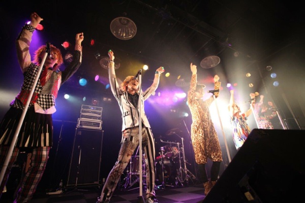 いよいよこの日のゲストであるカメレオの登場だ。「脳細胞をぶっ潰すほど暴れろ~!」とヴォーカリストのHIKARU.が初っ端からフロアを煽り、「捏造ピエロ」でライヴがスタート。フロア中にリングライトが煌めき、パーティ気分が盛り上がる中、豪快なサウンドが鳴り響く。続く「↑アゲていこう歌↑」ではメンバー全員がマイクを持ち、アイドルさながらに歌い踊り、何でもありのラップを披露する。無条件に楽しくなるポップチューンにタイトルさながらテンションが高まるようだ。「ニート姫」「ダメ男」と、ファニーなリリックがクセになるアッパーチューンを連発。MCではカメレオサンタからのプレゼントや、ギタリストTakashiのショートコント、さらに「Takashiが他の出演者に先輩面していた!?」……なんて暴露話も飛び交った(笑)。中盤の「vs 劣等コンプレックス」ではベーシストのKouichiとドラマーのTakeshiによる豪快なリズムがオーディエンスを煽り、フロアはヘドバンの嵐に。6曲目はリリースされたばかりのシングルにして、先輩バンドであるSIDのカヴァー曲「妄想日記」をライヴ初披露。ジャジーかつ歌謡曲な雰囲気は大人の色気を見せ、バンドの多彩性を感じさせてくれた。その後は「ごめんなさいっ!」、「21世紀マン」と弾けまくりのサウンドで会場を大いに盛り上げ、興奮も絶頂のままに最後の「始まりの歌」へ。拳を高く掲げ、最後の最後までテンションをブチ上げたまま、全9曲を走り抜けていった。