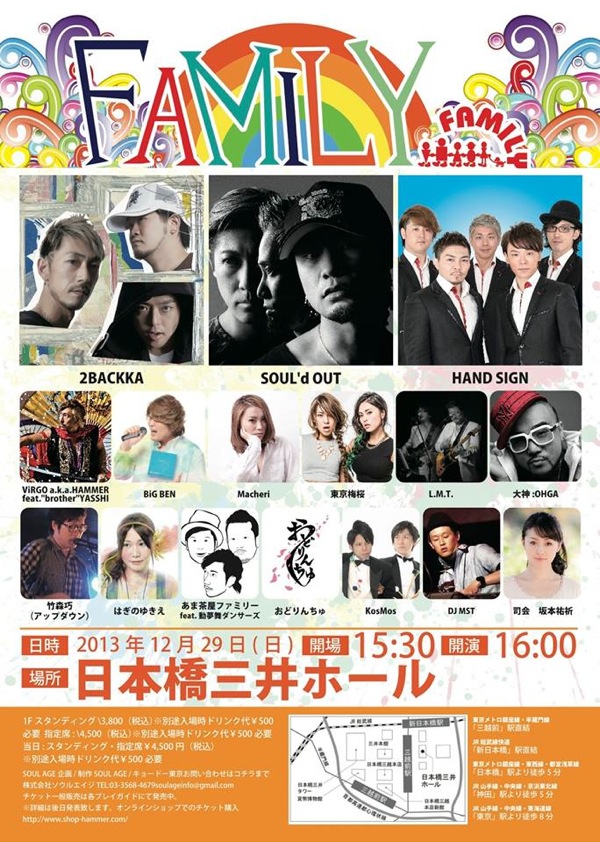<FAMILY>は、2011年から毎年年末に開催されている一大イベント。過去には土屋アンナをはじめTiara、菅原紗由理、Da-iCE、 AeLL.といった多彩なアーティストが出演。2013年は2BACKKAのほか、盟友SOUL’d OUT、HAND SIGN、BiG BENや大神:OHGAらが出演。「よさこいを通して日本を元気に」をテーマに掲げて活動している学生団体のおどりんちゅも出演し、バラエティ豊かなラインナップとなっている。
