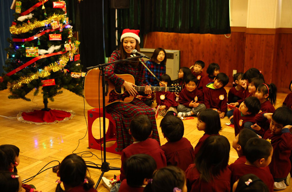その後、住岡と子どもたちによるスペシャルコンサートが開催され、「鈴楽器だけではなくて、手や足の全身も使って、音楽を楽しみましょう!」と声をかける住岡に、子どもたちは自ら立ち上がって近づいて楽しそうに歌い、全員で元気いっぱいに「ジングルベル」を大合唱した。住岡も「普段子どもたちの前で歌うことはあまり無いのですごく楽しかったです」と、一足早くクリスマスを満喫していた。