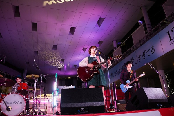 映画『カノジョは嘘を愛しすぎてる』(12月14日公開)の劇中バンド、MUSH&Co.(Vo.小枝 理子役・大原 櫻子、Gt.君嶋 祐一役・吉沢 亮、Dr.山崎 蒼太役・森永 悠希)が、12月21日、<MUSH&Co. クリスマススペシャルライブ>をダイバーシティ東京プラザフェスティバル広場にて開催した。