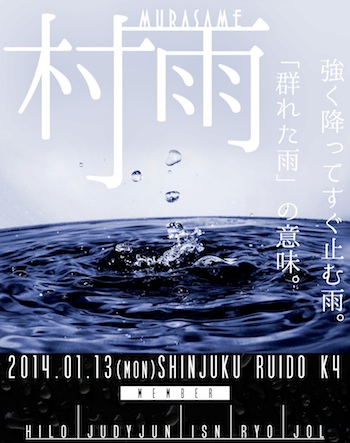 2014年1月13日新宿RUIDO K4にて開催されるK4 R presents<Crazy Booorn!! 新春番外編>にて豪華キャストが揃う中、1日限定セッションバンド<村雨-murasame->が結成された。メンバーはNEW ANSWER IS NEW ENDINGことNAINEからボーカルhiLo、ex Kiss My WayからギターJUDY隼、ex brick breakからベースisn、キーボード涼、そしてex QuinstetからドラムJOLが集まり当日限定のセッションライブを決行する。各メンバー日頃のスタンスやスタイルと違った一面を見せながらも攻撃的なサウンドを作り上げていくに違いない。1日限定のセッションバンド村雨-murasame-、是非チェックしてほしい。
