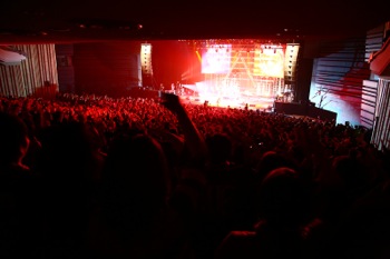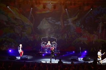 会場が暗転し、カウントが始まると1曲目に披露されたのは「World’s End」だった。メンバーの姿はスクリーンの奥のまま、そこにPVが映されると彼らの姿は見えずとも突き抜ける爆音に期待が高まり、興奮を抑えきれない大きな歓声が上がる。そして幕が一気に落ち、ステージにメンバーの姿が見えると場内から割れんばかりの歓声が。