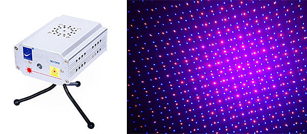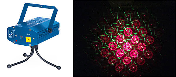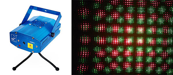グリーンとレッドのレーザーダイオードを使用。2色のライトが、動きながらシンプルな模様を描く。