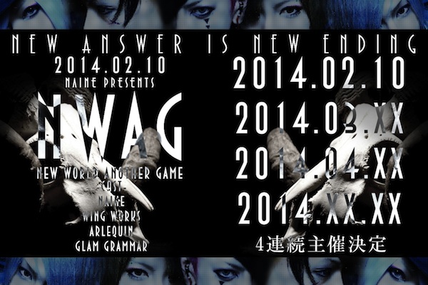 ネオ・スクリーモシーンを先駆する「New Answer Is New Ending」ことNAINEが、4連続主催を発表した。先ずはその第一弾となる2014年2月10日(月)に渋谷REXにて<NWAG-New World Another Game->が開催される。出演のWING WORKS、アルルカン、Glam Grammarと、新進気鋭の今を駆けるバンドが集まりイベントを繰り広げていく。また、イベントタイトルは出演するアーティスト名の頭文字から取っており、このメンツでの4マンライブという事への拘りが感じられる。