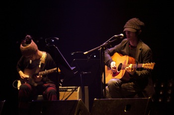 「今日、手伝ってくれるHINTOの伊東ちゃんを紹介します」という木下のMCに導かれて登場した伊東は、まずディレイの掛かったサウンドを愛用のストラトキャスターで響かせた。曲はkilling Boyの「Perfect Lovers」だ。伊東が弾いた数小節のアルペジオをサンプリングしてループさせ、その上に自らが別のフレーズを乗せていくというひとり二重奏によるイントロ。そこに木下のヴォーカルとアコースティックギターのストロークが絡み合うアレンジは6/8拍子の楽曲を幻想的に彩った。そして「Call 4 U」「Sweet Sixteen」といったkilling Boyのナンバーの後に披露された4曲は、カバーソングだった。