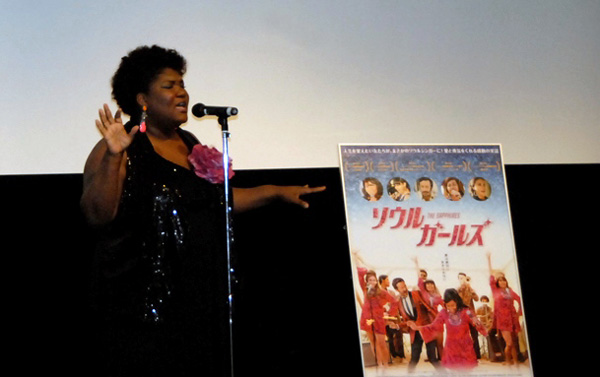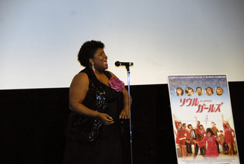 MCに呼ばれ、オリビア・バレールは映画上映後の熱気溢れる会場に登場した。オリビア・バレールは17年前にカナダから日本へ来日し、絢香、JUJU、中島美嘉、AIといったアーティストのバックコーラスを務め活躍するシンガーだ。彼女もまた映画『ソウルガールズ』の主人公サファイアズ同様に、故郷を離れた土地で成功を収めたアーティストでもある。