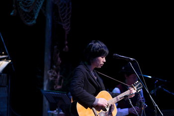 18時の開場から続々と人が集まる伝承ホールのロビーには、手紙社がオープンしたcafeが登場。珈琲はもちろん、紅茶やビオワイン、シードル、シナモンやイチジクのシフォンケーキ、イチジクとくるみのパウンドケーキ、チーズやみそ味などのビスコッティ、クリームチーズとオリーブなどバラエティ豊かなFood&Drinkが、寒さに身を震わせた来場者の心も身体も温かくほぐした。19時をほんの少しまわったタイミングでステージ上にバンド・メンバーが全員登場、1stアルバムのタイトル曲「Rocking Chair Girl」で、SASAKLAのコンサートは幕を開けた。