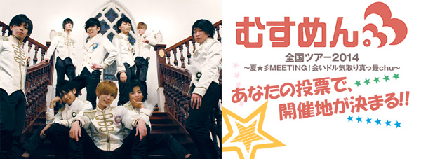 ニコニコ動画やYouTubeで活動していた人気ユーザーが集まり結成された男子アイドルユニット、むすめん。が<全国ツアー2014~夏★彡MEETING! 会いドル気取り真っ最chu♡~>開催とオリジナル1stアルバムのリリースを発表した。