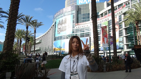 今回のステージは、気温20度を超えるアメリカ・カリフォルニア州アナハイムコンベンションセンターの中にある、壁一面にギブソンとエピフォンのギターがずらりと並んだギブソンブース。楽器のバイヤー、メディア関係者、アーティストなどが続々と the NAMM showに来場、コンベンションセンター内に人で溢れる中、午前11:00、ステージに登場した片平里菜は、まずエピフォンギターの伝道師として世界中を飛び回るドクター・エピフォンことウィル・ジョーンズに紹介され、「Hello,I’m Rina Katahira.I’m from FUKUSHIMA,JAPAN」と英語で挨拶。最新曲「女の子は泣かない」、「Oh JANE」という仮タイトルが付けられた未発表曲、地元・福島に思いを馳せて書いた人気曲「amazing sky」の3曲を歌唱。多くの外国人が食い入るように見守る中、初の海外ライブを無事に終えた。