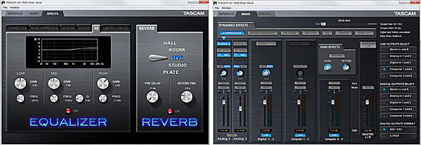▲内蔵DSPミキサーにはコンプレッサーなどのダイナミックエフェクト、リバーブなどのエフェクトを用意。スタンドアロン動作時は、内蔵DSPミキサーの設定変更不可。また、88.2kHz/96kHz動作時は、ダイナミクスエフェクトまたはセンドエフェクトのどちらかのみ使用可能、176.4kHz/192kHz動作時はエフェクトが使用できない。