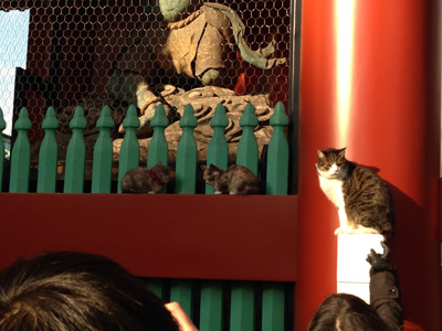 浅草寺に行くまでの仲見世通り、空がきれいでしょう?次のは雷門にいた子猫とその親と思われる猫。皆に写真を撮られてました。アイドル子猫。