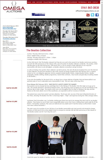 Omega Aucitonsは、ザ・ビートルズの「Can’t Buy Me Love」50周年を記念し、同シングルが英国でリリースされた3月20日に彼らの地元リバプールで<The Beatles Collection>と題したオークションを開く。ネットで生中継され、世界中どこにいても落札できるという。コートをはじめ200点以上のザ・ビートルズのメモラビリアが出品するそうだ。