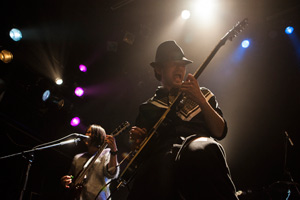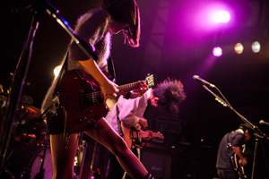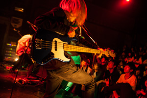 まずは2月19日にリリースとなる待望のニューアルバム『Masked Monkey Awakening』から、リード曲「猿は木から何処へ落ちる」、アルバム先行シングル曲「午夜の待ち合わせ」、「越境」とたたみかけるように繰り広げた。豪快なサウンドにエキセントリックなメロディーは、否応なく体も心も揺さぶり、ステージ上でアクティブに動きまくるシュンタロウ(Vo&G)、ナルミ(G&Vo)、タソコ(G)のフロントギター3人のパフォーマンスを目にした観客は、全力で拳を突き上げて応えていた。