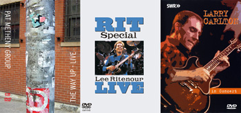 一方の『フュージョン3大ギタリスト ~ リトナー / メセニー / カールトン』は、フュージョン・ギターと言えばこの3人というラインナップが収録されている。リー・リトナーは、1984年作『バンデッド・トゥギャザー』リリースに合わせて行ったライブ映像で、若々しく躍動的なロックサウンドを意識したパフォーマンスを披露する。パット・メセニーは、2004年の傑作アルバム『ザ・ウェイ・アップ』に合わせたツアーを収録し、レコーディング・メンバーがほぼ全員参加、4パートから成るアルバムを完璧に再現した内容が大きな話題を呼んだもの。ラリー・カールトンは、MCAへの移籍前の1984年、ドイツの人気TV番組「オーネ・フィルター」のスタジオライブ映像が収録され、ヒット曲や代表曲を80年代テイストたっぷりに弾きまくる。