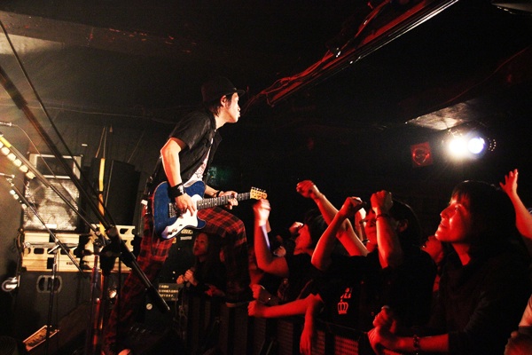 かつて「部活」と例えていた事もあり、マイペースながらも攻撃的でエネルギッシュなGHEEEのライヴが終了し転換後のステージに目をやるとフロントにスネアドラムがセッティングされている。「おっ!?」と思っているとSEの中メンバーが登場。Drの中畑大樹がそのスネアドラムの前に立ち、メンバー4人が横一列に並んでスタートしたのは新曲の「Tomorrow never knows」。現在レコーディング中の楽曲で、この日初めてライヴで演奏されたこの曲は明るく爽快なロックナンバー。まさかの4人並んでの演出と楽曲の持つハッピーなテンションが相まってスタートからフロアは大盛り上がりだ。次の曲からは中畑がドラムセットに向かい「ダミーリリック」「ジャンクフード」と杉本の代名詞とも言えるエッジの効いたギターリフが印象的なアッパーな曲が続く。