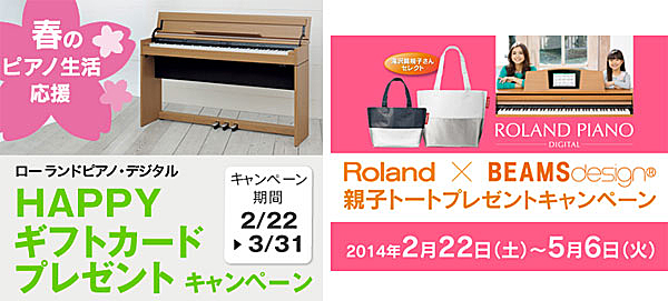 ローランドは、電子ピアノの購入者を対象とした2つのキャンペーン、「ローランドピアノ・デジタルHAPPYギフトカードプレゼントキャンペーン」、「ローランドピアノ・デジタル×ビームスデザイン(R)限定コラボ親子トートプレゼントキャンペーン」を実施中だ。