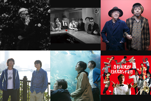 ▲写真左上より:細野晴臣、高橋幸宏&METAFIVE(小山田圭吾×砂原良徳×TOWA TEI×ゴンドウトモヒコ×LEO今井)、No Lie-Sense(鈴木慶一&KERA)、真心ブラザーズ、cero、奇妙礼太郎 トラベルスイング楽団。