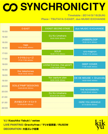 タイムテーブルの詳細はSYNCHRONICITY公式サイトの一覧を確認いただくとして、各会場のトリを飾るアーティストには、TSUTAYA O-EASTは渋さ知らズオーケストラ、duo MUSIC EXCHANGEはOGRE YOU ASSHOLEが決定している。また、最終発表となった出演者陣にはDE DE MOUSE + Drumrollsの他、タップダンサーのSARO(-kikyu-)が追加され、ミュージシャンやDJ、ライブ・ペインティングなど合わせて総勢20組の出演となる。
