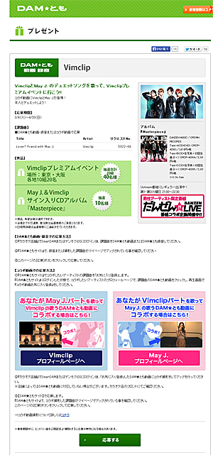 VimclipとMay J.のデュエットソングを歌って、抽選でVimclipプレミアムイベントに参加できるプレゼント企画が、第一興商が運営する通信カラオケDAMと連動したサービス「DAM★とも」でスタートした。