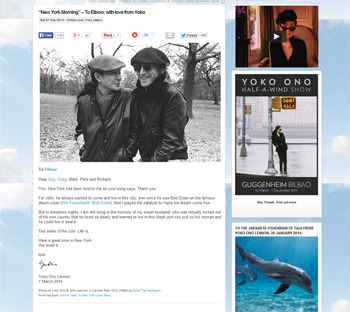 これに対し、彼女はオフィシャル・サイト(Imaginepeace.com)にエルボー宛の公開書簡を掲載。ジョン・レノンと一緒の写真も載せ、彼とニューヨークの逸話について触れた。