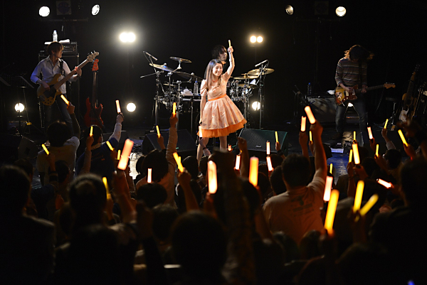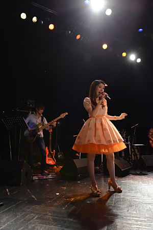 会場が暗転し、拍手の中、ペールオレンジ地に花柄模様、ベルト、裾がオレンジ色のフレアワンピースで南里が登場。「月導―Tsukishirube―」のイントロが流れると、会場が青いサイリウム一色となり、いっせいに振られる。アッパーな曲で早くもファンと一体感が生まれる。続いて、「春風によせて」では、一転、軽やかなメロディーに合わせ、弾むように歌うと、会場のファンも身体をスウィングさせていく。