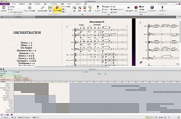 ▲新たに追加されたタイムライン・ウィンドウ(画面下側)により、大規模楽譜の把握が容易に。