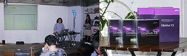 ▲発表会ではSibelius 7.5の使いやすさと新機能をアピール。フロンティアファクトリーが販売するパッケージはスリーブなども入れておけるサイズ(写真右後列)。