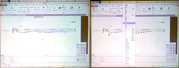 ▲パソコンのキーボードで軽快に入力(写真左)。強弱記号もマウスで選択、好きな位置に配置できる(写真右)。