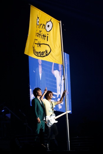 そして場内が暗転。ステージ上方にとどまっていたキューブが、最新シングルから過去へと巻き戻すようにジャケット写真を映しながら下降していき、完全にステージに着地したところでメジャーデビューシングルのジャケットが映った。ライトに照らされてキューブの上に立っているふたり。もちろん曲は「アポロ」だ。メジャーシーンでのポルノの歴史が始まった大事な1曲だが、ここでしんみりと感慨深くひたっていられるはずがなく、最後の最後まで観客たちは体を動かして楽しんでいた。演奏が終わり、再びキューブが上昇したそこには、旗とともにふたりがステージに立っている。その顔は、まるで月面へ初めて着陸した宇宙飛行士のように、やっとここまで辿り着いたぞと少し誇らしげな表情に見えた。