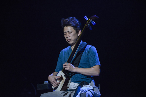 会場に風を巻き起こすような勢いがある三味線の合奏で幕を開けた3度目の同舞台。冒頭は上妻宏光が、「津軽じょんがら節」をベースに制作した「BEAMS」などオリジナル曲で観客を楽しませた。中盤にはダンス集団DAZZLEが、森の中で狐の嫁入り行列を目にした人間の男が、狐に取り込まれてしまう劇「狐劇」を熱演。三味線を弾く上妻宏光の周りを、狐の面を付けた男たちが取り囲むなどし、独特の世界観が広がっていた。