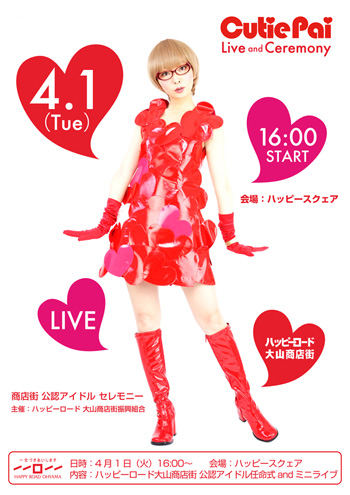 テクノ・ポップDIYアイドルCutie Paiが、2014年3月22日に東京都板橋区ハッピーロード大山商店街の公認アイドルに就任した。それを記念したセレモニー&ミニライブが、4月1日(火)16時より商店街イベントスペース「ハッピースクェア」で開催される。