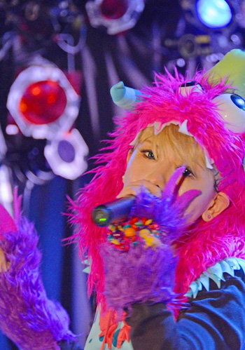 会場にはたくさんのファンが集まり、期待と興奮の熱気に包まれていた。客電が落ちると、オープニングの雷鳴と共に風神と雷神が登場。芝居の始まりである。徐々に心高まる音楽と演出の中、ステージ上中央に用意された卵がメンバーによって割られてエコ怪獣が登場しライブは始まった。