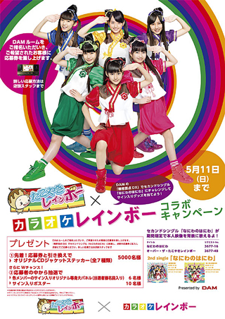 ももいろクローバーZの姉妹グループであり、関西を拠点に活動する人気急上昇中のアイドルグループ「たこやきレインボー」。地域限定発売のセカンドシングル「なにわのはにわ」(3月19日)も好評の彼女たちが、関西を中心に展開するカラオケ店「カラオケレインボー」とコラボキャンペーンを行う。名前が似ているという縁で決定した初のコラボキャンペーンは、先着&応募でレアなプレゼントがゲットできるファンなら見逃せない企画だ。
