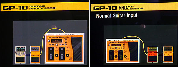 本体サイズは251×207×71mmとコンパクトながら5つのペダルを装備、さまざまなエフェクトボードに載せることができる。ここでは2つの使用例が挙げられた。まず、GK INへの接続で「GP-10」をダウン・チューニング専用機として使い、その後ろに通常使っているエフェクトを接続する。もう1つは、ノーマル・ギター・インプットを使用した場合で、「GP-10」を空間系エフェクトとして使うという例だ。