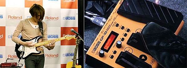 ▲GT-001、GP-10のデモ演奏は関秀樹。ペダル操作でさまざまなサウンドを次々を聴かせる。