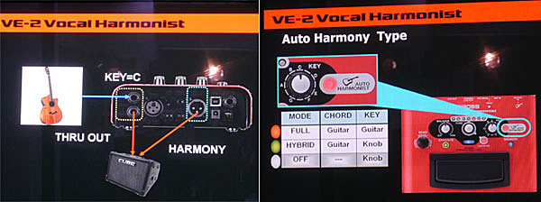 ここで驚かされたのが、ハーモニーの検出だ。「VE-2」には、ボーカル入力とは別に、ギターまたは鍵盤楽器を接続する入力端子を装備。ここに楽器の演奏が入力されると曲のキーを判定する。コードを解析するのではなく、キーを解析するのだ。その判定結果がCなら、入力されたボーカルに対してCのキーのハーモニーが付加されて出力される。コードに対するハーモニーではないので、より音楽的なハーモニーが付けられるとのこと。